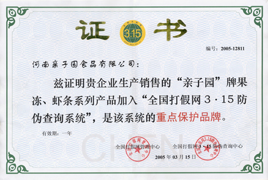 ★在全國打假網(wǎng)“重點保護產(chǎn)品(單位)”活動中被授予2005年“重點保護產(chǎn)品(單位)”稱號。